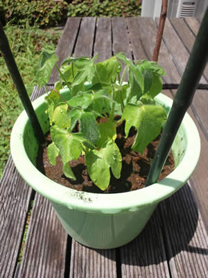 商店街のおじちゃん、 なかなか朝顔が大きく ならないので、ささえ ぼうを使ってみたそう です。朝顔ちゃん、 これで大きくなるのかな?横のぼうが足りな いよー。